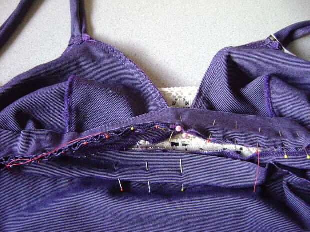 Lugar la orientación sobre la banda superior de la falda mientras que empareja la costura lateral coincide con para el mismo lado que el la costura de cordón. Asegúrese de que las dos telas derecho lados juntos (excepto donde pasa la taza del sujetador será el lado equivocado de la taza al lado derecho de la cara). Pin el frente a la franja superior de la falda. Debe ser como un sándwich en la partes superior tira/bra copas o correas / frente. PIN e hilvanar todo excepto salto sobre las correas de la espalda. Deje las tiras espalda sólo cubrió juntos. No Hilvanar sobre las tiras espalda.