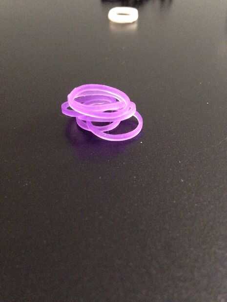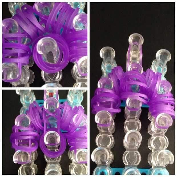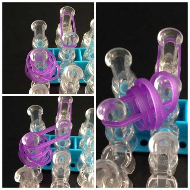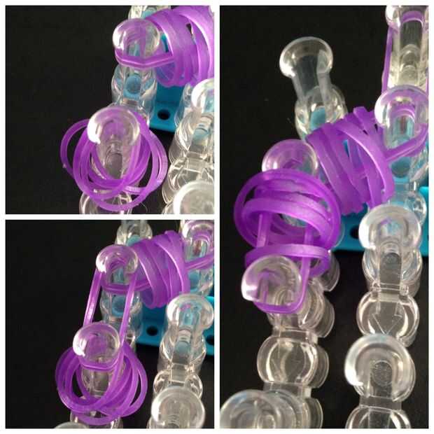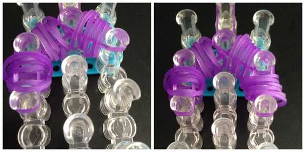 Los súbditos púrpura son todas diferentes, pero todos ellos tienen pelo loco! Utilizar como muchos o como bandas poco que quieras para esta parte. Más bandas hará el pelo más grueso y menos bandas hará el pelo más fino. Voy a utilizar 6 seis bandas de jalea púrpura para mi pelo. Coloque las bandas en una clavija como se muestra en la primera foto. Luego coloque doble bandas del mismo color y las bandas de pelo sobre él en la parte superior de la misma, también se muestra. Repita este proceso hasta que el súbdito tiene la cantidad de pelo que se muestra.