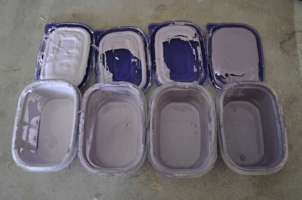 Compré tres tamaños diferentes de la muestra de pintura. Dos en el color púrpura estaba pintando la parte principal de la dresser y uno en blanco (sólo la muestra sin color.) Uno de los contenedores púrpura y los contenedores blanco y medir la pintura en los recipientes para obtener el gradiente del ombre. Tuve 4 cajones así que poner 5 cucharadas de pintura en cada recipiente.