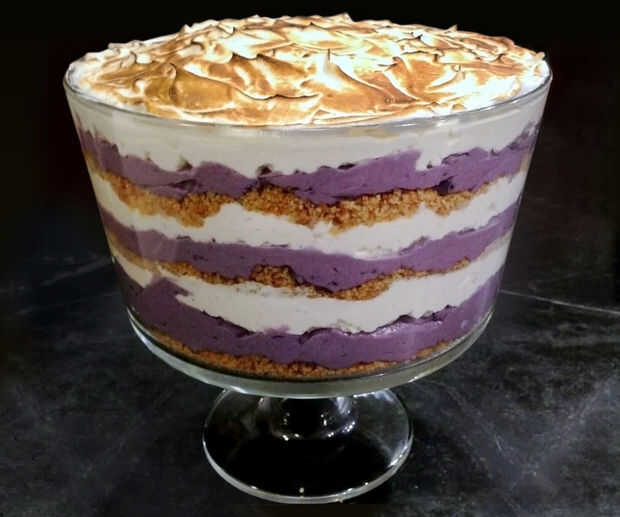 esta combinación poco impar de un tonto, un poco y un parfait fue un experimento para el 2013 de acción de gracias. Usé el camote morado en vez de la variedad naranja estándar, un montón de crema batida y capas de tierra, coco tostado y macadamia, con un merengue en la parte superior. Resultó bien! Los niños estaban especialmente entusiastas aficionados.