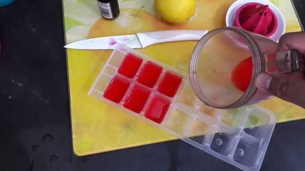 En primer lugar, llenan la bandeja del cubo de hielo la soda con sabor a fresa.