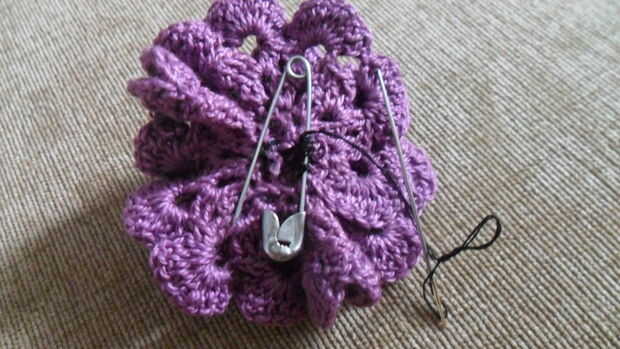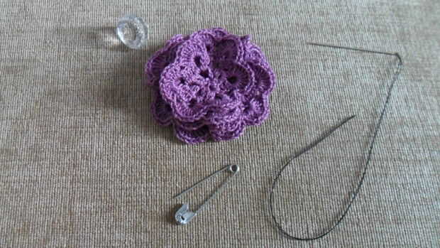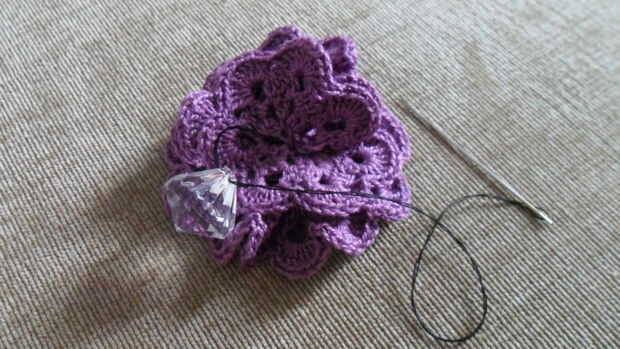 después de que la forma como la rosa, utilice el hilo y la aguja para fijar la rosa, luego añadir el diamante en el frente y el perno de seguridad en la parte posterior