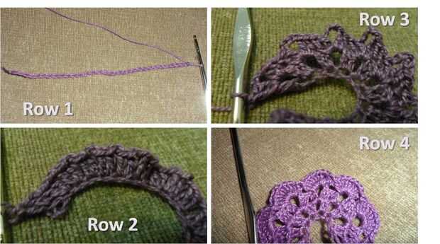 3ª fila: en la c.c. de hacer 2 de 1 canal + 3 ch + 2 dc, para que se vea como 4dc y 3 ch