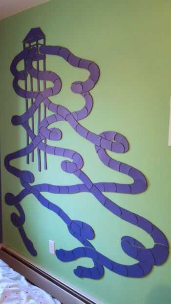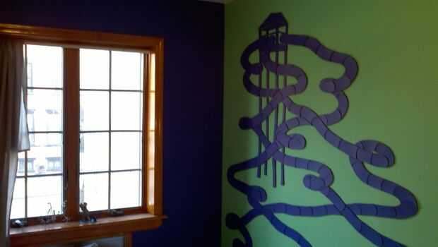 Una cosa que hace difícil este proyecto era que el cartón pluma ligeramente rizado cuando se pinta con pintura de látex en un lado. Tuve que doblar algunas de las piezas planas por lo que quedaría en la pared. Es también más limpio cuando uniformemente plana. No sé qué les plana, pero pintura que al reverso puede o aplanar las tablas todo bajo algo más plana. En general no es demasiado malo como es, y estoy bastante contento con él. Aún ilumina mi habitación y hace amigos visitantes que es habitación de un niño pequeño la broma.
