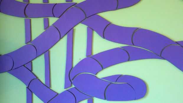 -Retirar pequeñas secciones del bosquejo de la pared uno a la vez y les viró ligeramente sobre el tablero de cartón pluma púrpura.  Entonces corté alrededor de cada forma con un corte de cuchillo xacto a través de sketch y tablero más abajo.  Como cada pieza suelta, etiqueta su espalda para mantenerlo organizado.