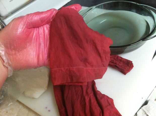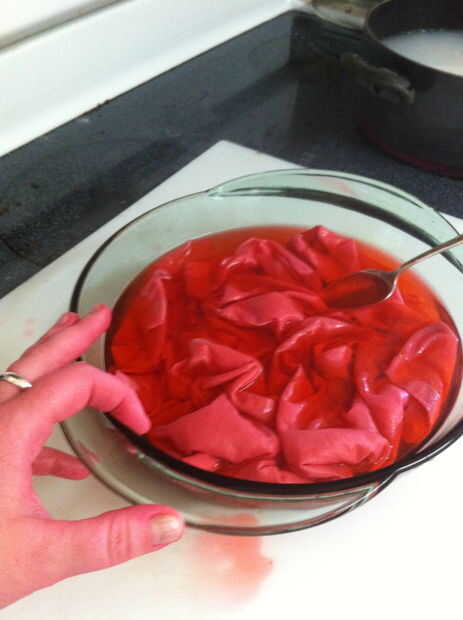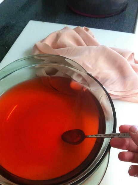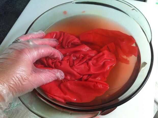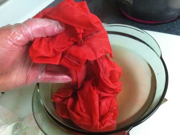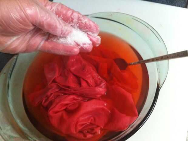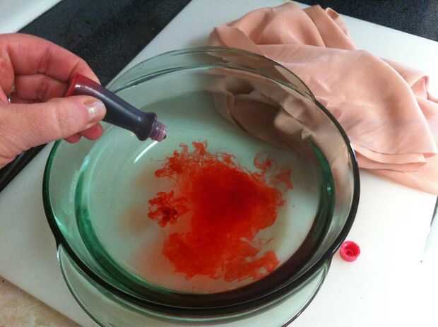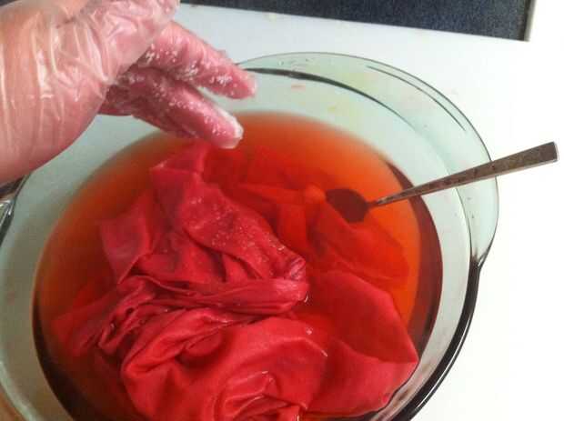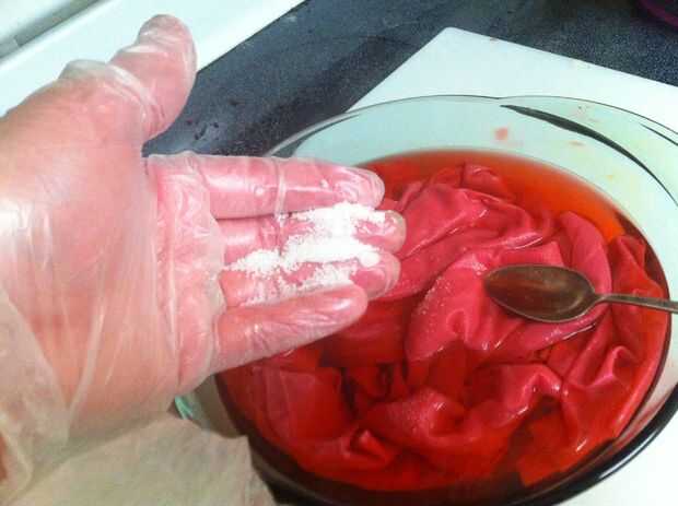 Hay algunos problemas con ciertos colorantes alimentarios rojo que los hace un poco complicado. He leído que reaccionan al ácido y congela en la superficie de algo, no acercarse bastante a la proteína a teñirlo. Al parecer la forma de evitar esto es añadir los tintes que contienen rojo para el agua caliente, añadir la seda o la lana y luego añadir lentamente el ácido.