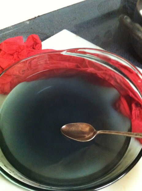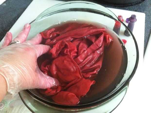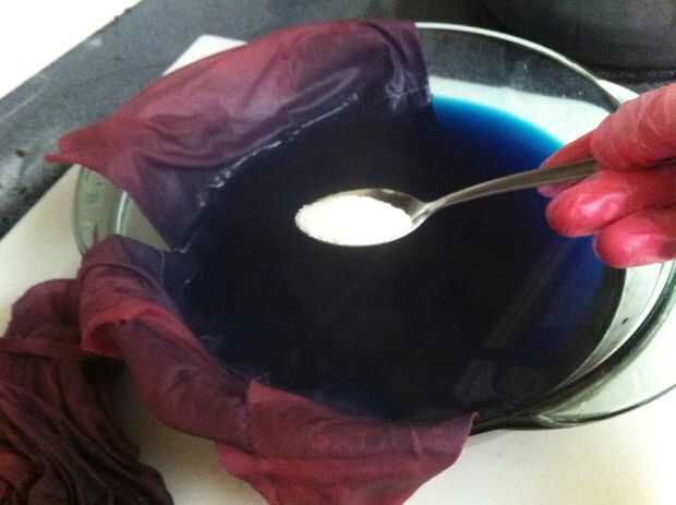 Calienta el agua en el microondas hasta que estaba empezando a hervir, luego agregar colorante de alimentos. Después de revolver el colorante, añadí la seda y luego generó en algunos ácido cítrico. Creo que he añadido aproximadamente una cucharada cafetera de ácido cítrico. Lo deje reposar un par de minutos, luego revisar para ver si el agua era claro (que es cómo usted sabe el tinte se ha adherido a la fibra y no flotando en el agua). No debe tomar mucho; Si es así, tratar de más calor o más ácido. Tintes rojos parecen adherirse a proteínas más rápido que los tintes más azules.