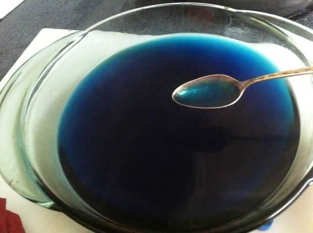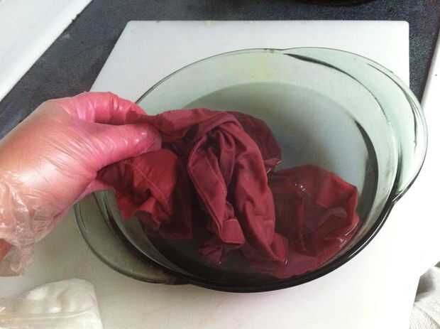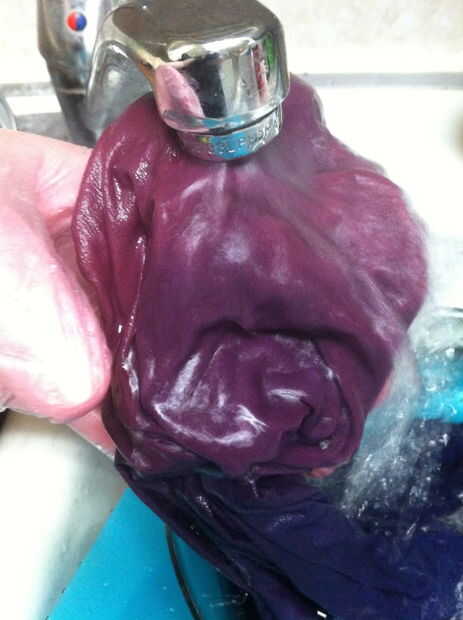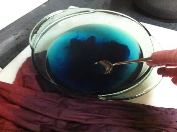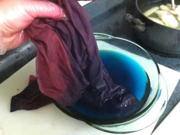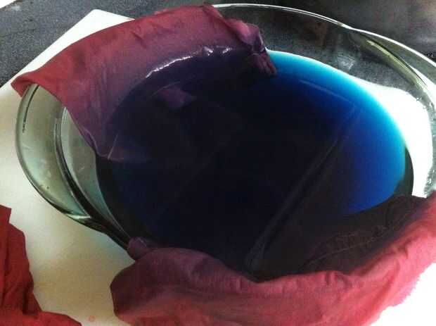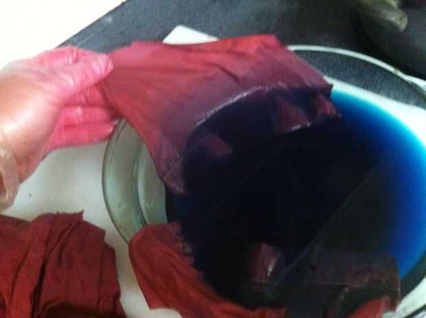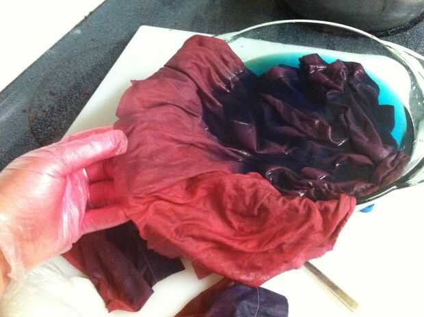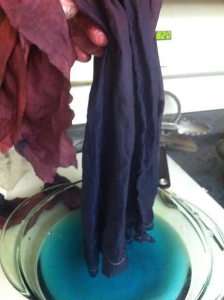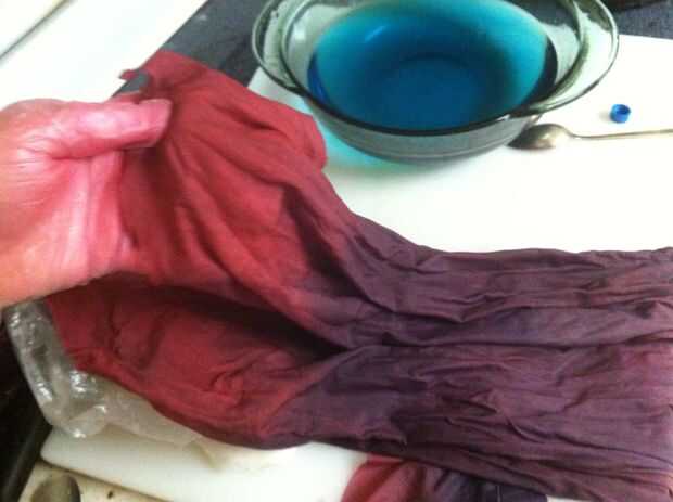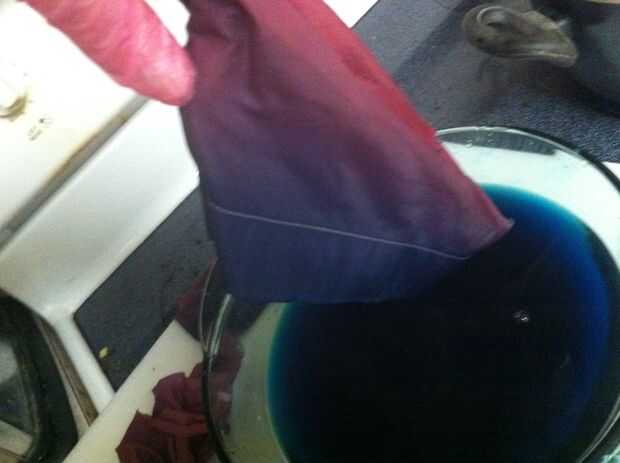 Una vez que el vestido entero y ambas mangas tanto rojo como quería, empecé a agregar algunos alimentos azul del colorante al agua y sumergir el vestido parcialmente en el baño de tinte, gradualmente construyendo un gradiente más azul. También hice esto a las mangas por lo que fueron profundamente azulado púrpura a lo largo de los bordes. Si usas una olla, a mantener el agua a fuego lento. De lo contrario, tendrás que seguir poniendo el recipiente en el microondas para recalentar el agua. Probablemente deberás añadir más ácido cítrico para obtener todo el tinte azul se adhieran.