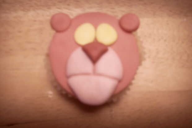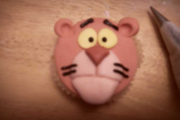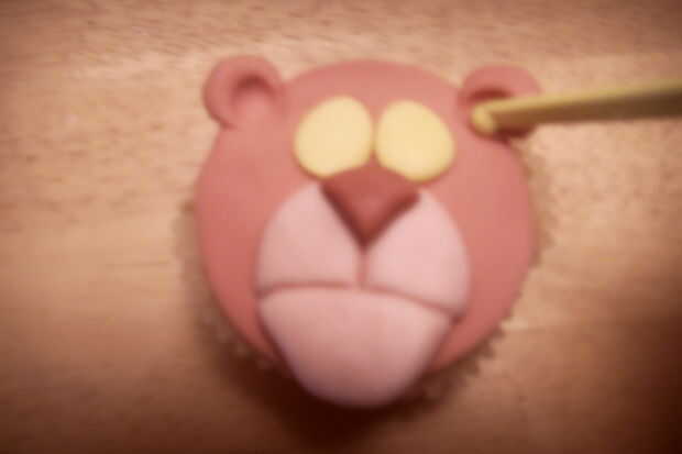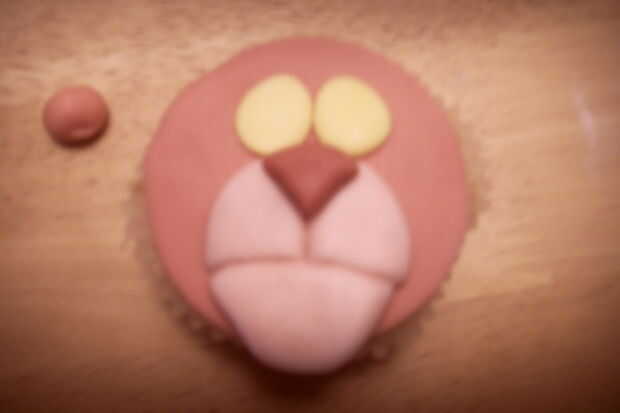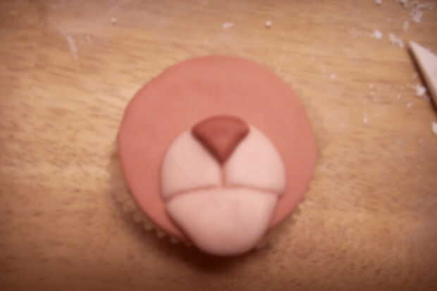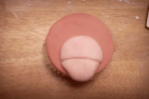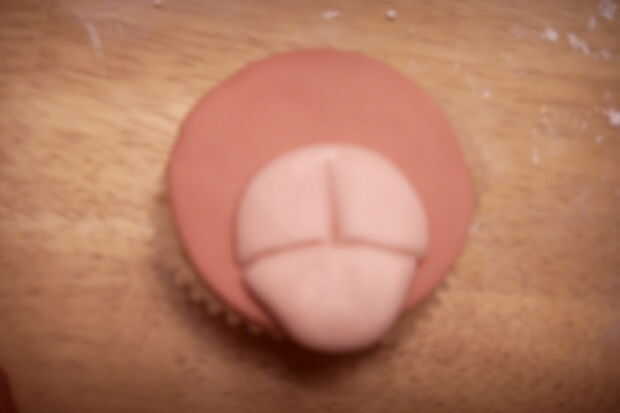 Rodar una gran bola rosa pálida. Aplana en la parte inferior de la torta de la taza. Marcar una línea curva, horizontal, como la boca.
