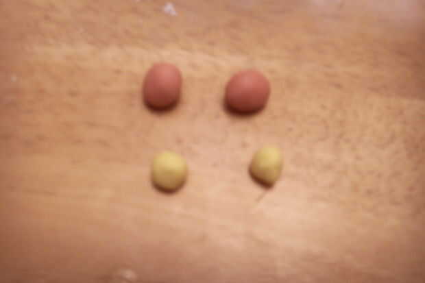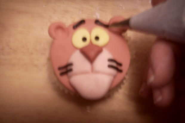 Aplanar las bolas amarillas en la torta arriba de la nariz como ojos.