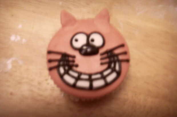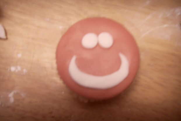 Hacer dos bolitas de pasta de azúcar blanca, aplanar el pastel en el nivel de los ojos.