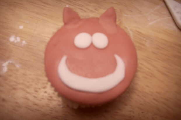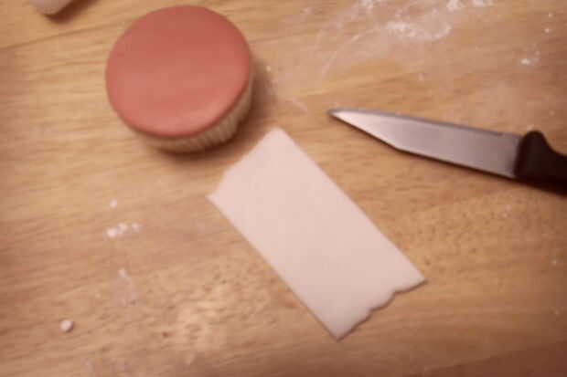 Hacer 2 triángulos de pasta de azúcar color de rosa, coloque en el borde exterior en consonancia con los ojos.