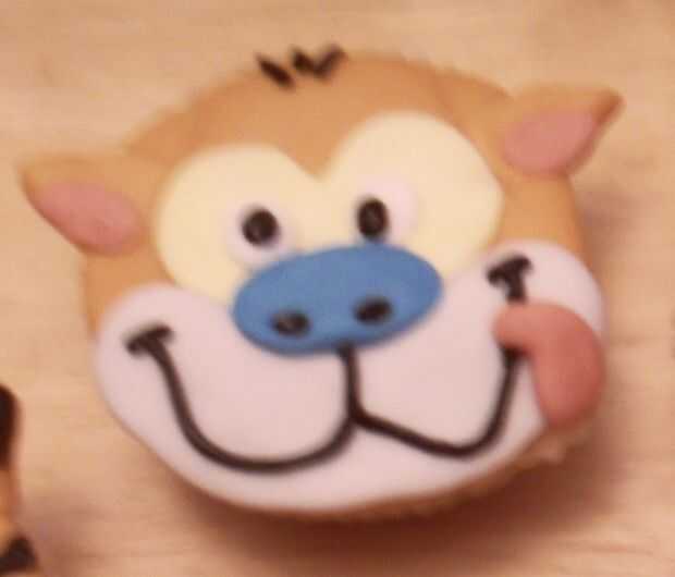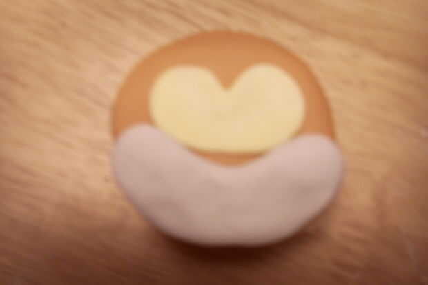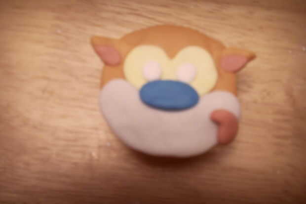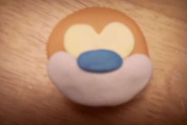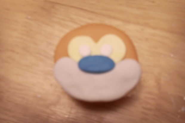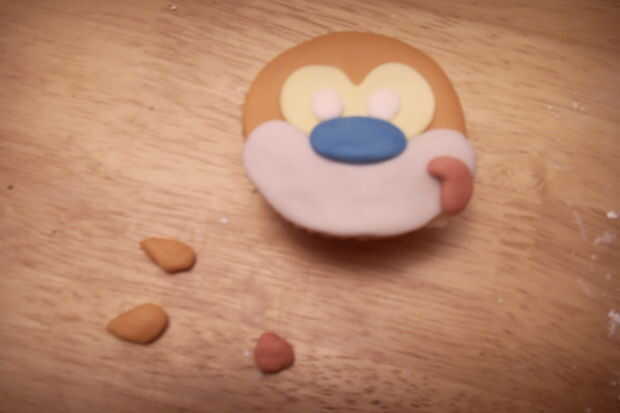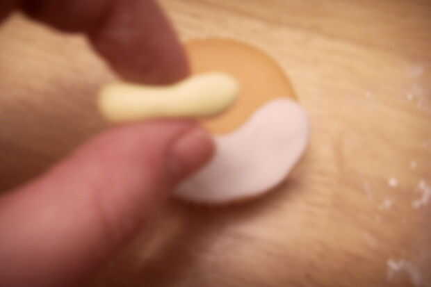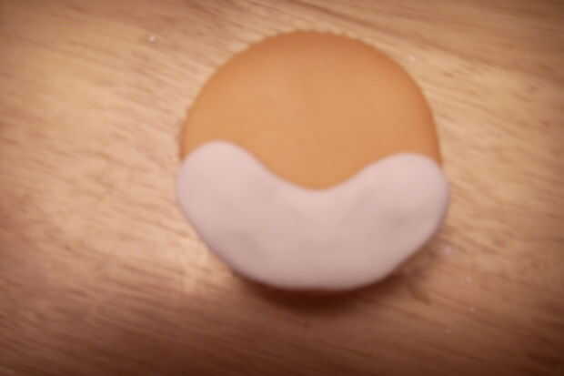 Hacer 2 bolitas de pasta de azúcar blanca, aplanar hacia fuera y pegarlos en ojos.