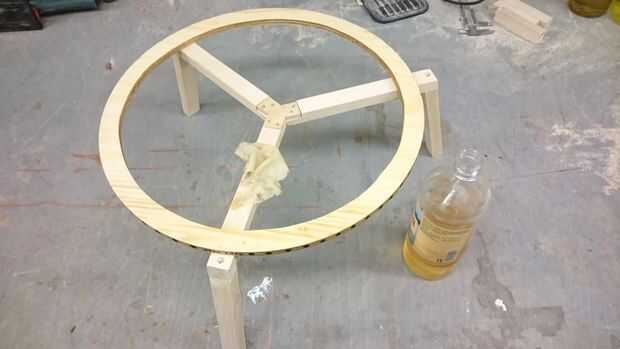 Para colocar las piernas a usan pegamento y tornillos. Asegúrese de haga agujeros para evitar rajaduras de la madera.