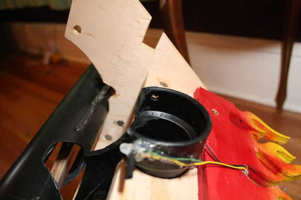 Para empujar el botón, alambré hasta mi servo restantes para el arduino, adjunta una barra corta de plástico a la parte giratoria del servo y ahora cuando el arduino detecta una bola en la apertura de la "hélice" gira el servo que empuja el botón, que envía los 24VDC al relé que energiza el motor, girando el rotor y conduciendo la pelota de golf del tubo ABS!