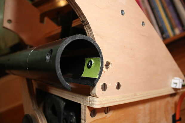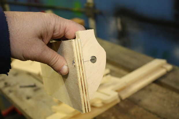 Siguiente un agujero es perforado por la cara de la pieza de madera contrachapada que desea conectar a la pieza anterior. Este agujero y el agujero a través del borde de la pieza deben ser del mismo tamaño - lo suficientemente grande para el tornillo de máquina.