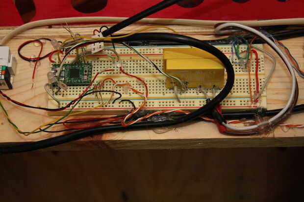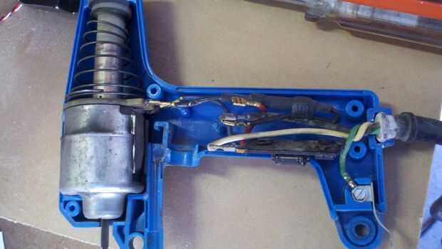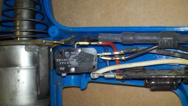 Retire el interruptor de gatillo y conecte los cables en su lugar. He utilizado conectores extraíbles si es posible asi puedo restaurar la pistola de clavos a su funcionalidad anterior si es necesario. Después de reemplazar el interruptor con cables pongo la pistola de nuevo juntos (menos las partes de gatillo y las piezas de seguridad)