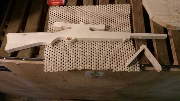 imprimí una imagen de un rifle que se duplicó en tamaño para que sea lo suficientemente grande, pegadas a la madera de pino y utiliza papel de grafito para remontar hacia fuera. cortar el rifle y el interior del arco del guardamonte y lijar los bordes para redondearlos un poco