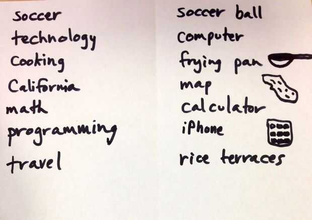 "Doble un pedazo de papel por la mitad longitudinalmente. En el lado izquierdo, escribir tantas ideas sobre usted mismo como usted puede." (3 minutos) "A la derecha, escriba un objeto o símbolo para cada idea (por ejemplo, un bate de béisbol para el béisbol). Usted puede también esbozo de objetos o símbolos."