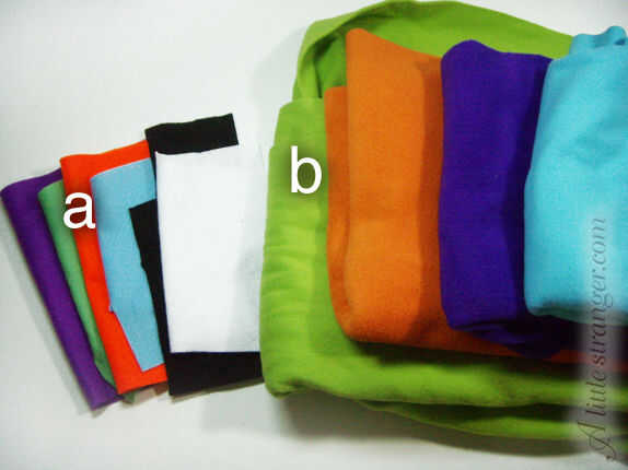 b) tela polar (naranja, verde lima, morado, turquesa)