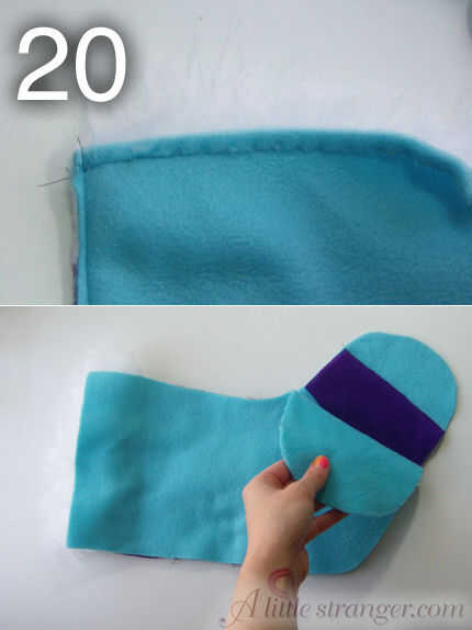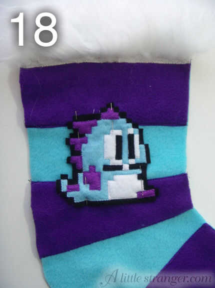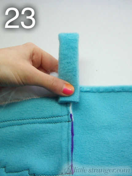 23) doblar el lazo colgante en la mitad y coser a mano en el interior de la media de, en la parte posterior de la pierna.