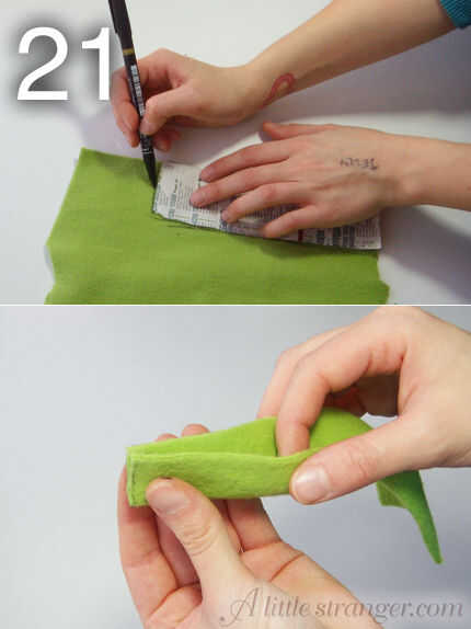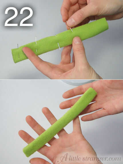 21) marcan el lazo colgante en tela polar (hice mía mi color principal media) recórtalo y dóblalo por la mitad longitudinalmente