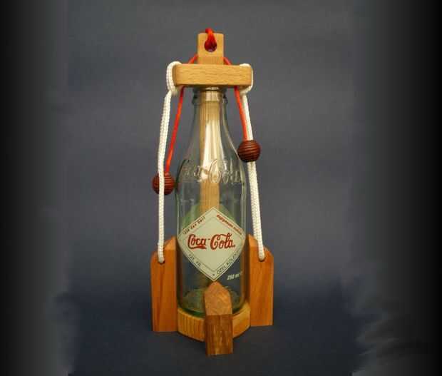 Hay una base y una tapa. El casquete se fija a la base con cuerdas blancas. El objetivo del rompecabezas es desmontar la botella retirando la varilla desde dentro de ella.