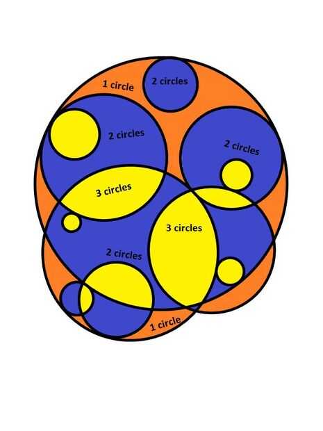 El título de este rompecabezas parece ser "Color por número". Son claramente los colores, pero ¿dónde están los números? Como se ve en el paso anterior, el número de círculos que circunda un área define el color. Por ejemplo, cualquier área circundada por 1 círculo es de color naranja, un área rodeado de círculos de 2 es azul y así sucesivamente.