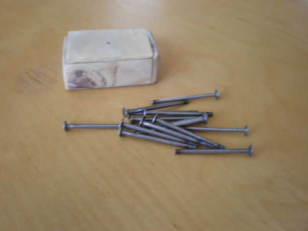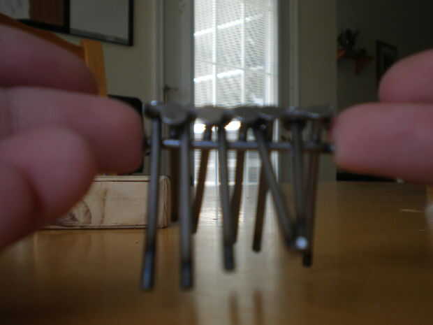 poner un clavo en la parte superior de la box.than puso un clavo en la tabla y los clavos en alternando las direcciones. una vez llegué al extremo de la uña que puse la última de ellas en la cima de los demás hacia la dirección opuesta de la segunda nail.once que tiene las uñas apoyadas recoger correctamente la uña inferior con los dedos medio y colocar los clavos en la parte superior el primero en la caja. Si usted dident entiende bien mis instrucciones suficientemente sugiero mirar a través de las imágenes. Si usted tiene cualesquiera comentarios, críticas o preguntas por favor dejan en los comentarios o pm me.