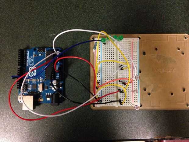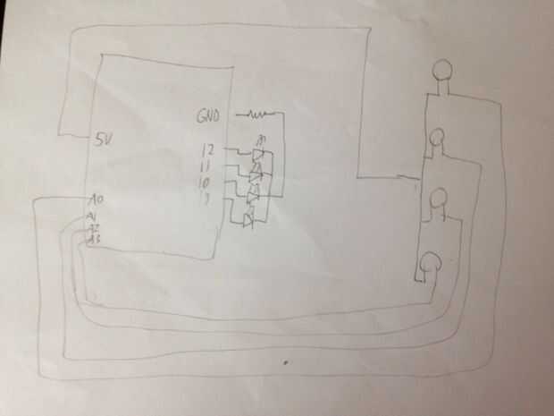 Plan del circuito. Este circuito debe consistir en un resistor de k 10, 4 LEDs y 4 fotocélulas. Un protoboard puede usarse inicialmente para la disposición fácil. En primer lugar, los LEDs pueden disponerse en paralelo, cada uno con un alambre de salto conectado a los pines digitales de arduino. Las fotocélulas del mismo modo se pueden organizar en paralelo, sin embargo cada salto cable para conectarse a la analógica pasadores en arduino como se indica en las imágenes de arriba. Un cable debe ser conectado al pin de 5V de arduino y suministrado al circuito de potencia. Un alambre de salto debe ser conectado de la articulación del circuito paralelo LED con la resistencia de 5 k y conectado al pin GND.