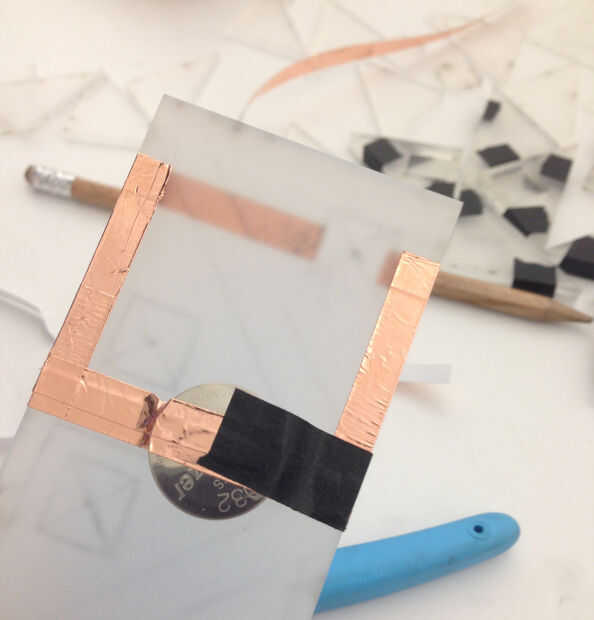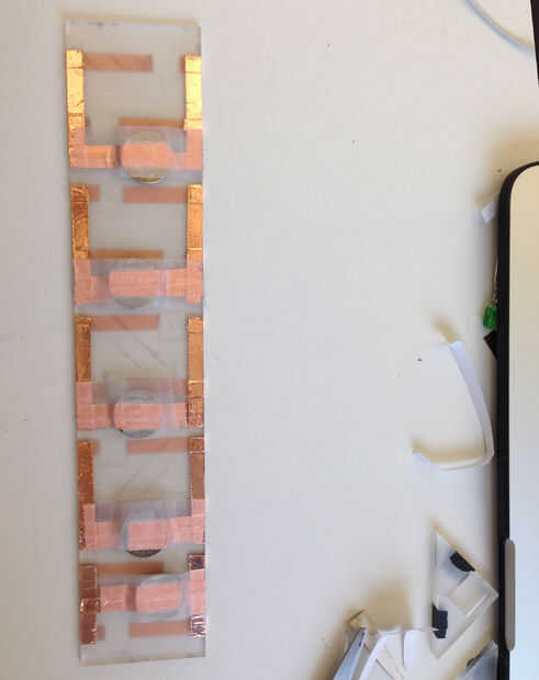 Utilice la pieza rectangular para fijar las pilas de moneda en circuitos paralelo. Dividir el rectángulo en 5 secciones, cada sección recibe una batería de la moneda conectada a 2 luces de LED en paralelo. La parte exterior tiene la cinta conductora donde se colocarán las piezas de LED. Es útil marcar estas secciones con el lápiz y da sentido u donde exactamente romper el circuito para que la pieza LED completarla. El lado oculto contiene las baterías y el resto del circuito. Utilice la cinta mágica para fijar las baterías. La cinta mágica es invisible por lo que no muestran cuando los LEDs se encienden. Hacer este procedimiento para todas las secciones de 5.
