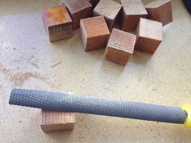 Bien el número de cubos de madera depende de cuán grande bloque de foto que están intentando hacer. Estas son 3, cubos de 5cm, porque la pieza de madera que llegué de la calle era 3.5x3.5x40cm.