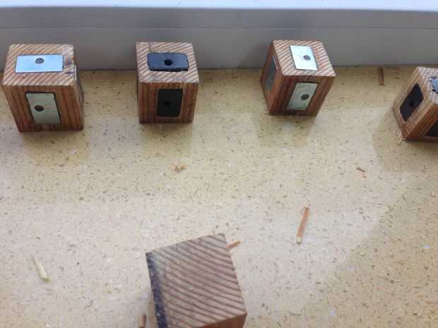 Una vez había formado su madera como cubos, es hora de marcar sus imanes en sus cubos. Iba a usar 54 imanes (6 al cubo) para obtener el perfecto puzzle magnético que puede girar 360 grados. Sin embargo era demasiado muchos agujeros que necesitan ser hechas.