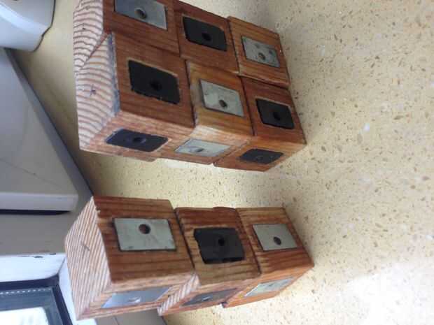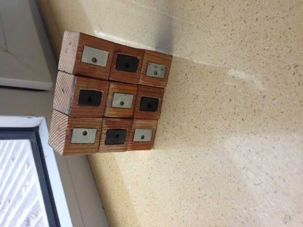27 3/4" de claro cubos de acrílico son perforados con orificios de 3/16 de 108", equipados con imanes de disco de neodimio de D32 108 con polaridad correcta hacia fuera de cada uno y montados en una versión magnética del cubo de Rubik original t
