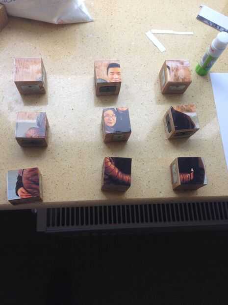 Ahora es el momento para iniciar la diversión parte. He elegido 4 de mi cuadro familiar y cortarlas en 9. Forma de mis cubos de madera no eran exactamente cubo, por lo tanto a veces necesita volver a medir su bloque de madera y cuadros antes de cortar.