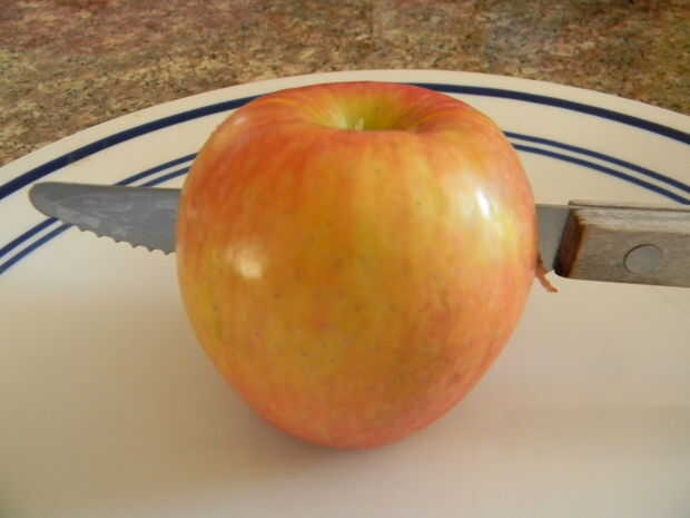 Corte, con un movimiento de sierra, manzana a medio camino en la parte superior con el cuchillo con los dientes para que accidentalmente no corta más en apple.