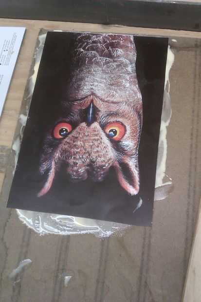 Este el el paso fácil pero importante, todo lo que haces es pegar la foto a tu material (yo usé Junta de grano de 1/8 pulgada) pero tienes que conseguir suficiente pegamento en el pic, el overkill de término no se aplica a este paso. Asegúrese de que peso la cosa hacia abajo mientras se seca, otra vez hay no hay tal cosa como demasiado con esta parte.