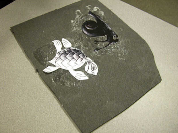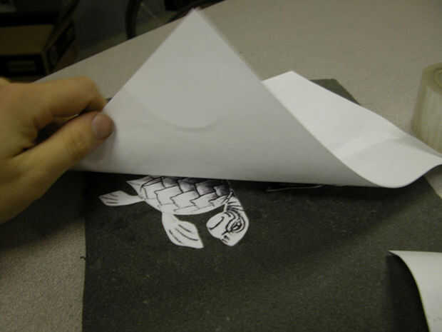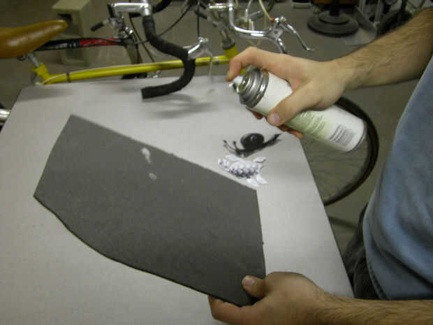 Aerosol del adhesivo de espuma de poliestireno-caja fuerte en la espuma (prueba de un pequeño parche primero). Mientras está todavía húmedo, alrededor de borrón de transferencia con el dorso de una de sus piezas del rompecabezas de papel. Después de la pieza y la espuma están uniformemente recubiertos, esperar un minuto para que el pegamento se consigue pegajoso, entonces palillo los dos juntos (diseño hacia arriba).