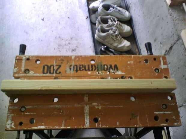 Vi el 2 x 4 en una longitud manejable. Corte dos pedazos de extremo que dará soporte a la pieza principal.