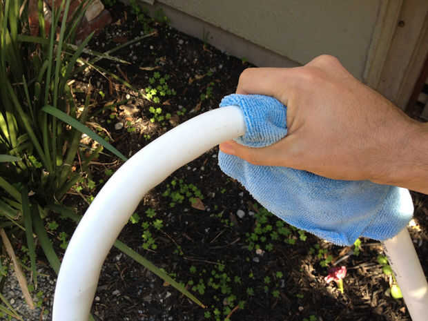 Con el tubo doblado, limpie con jabón y agua y séquelo. Ahora estás listo para aplicar la capa base de pintura blanca. Aquí, utilicé unos abrigos de blanco Krylon Fusion.