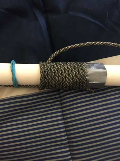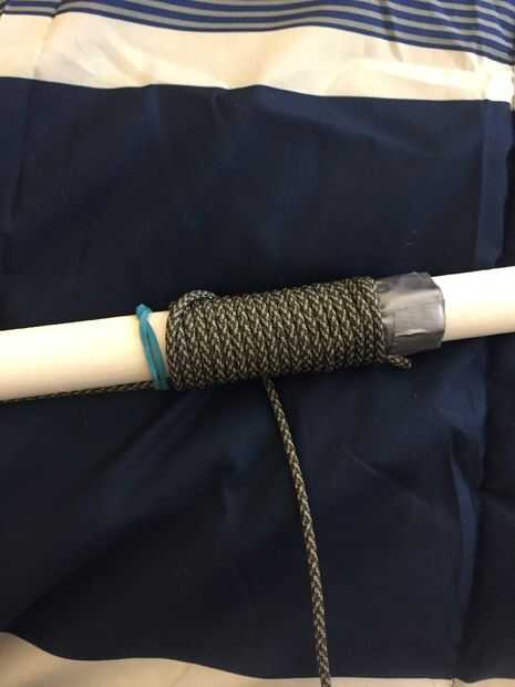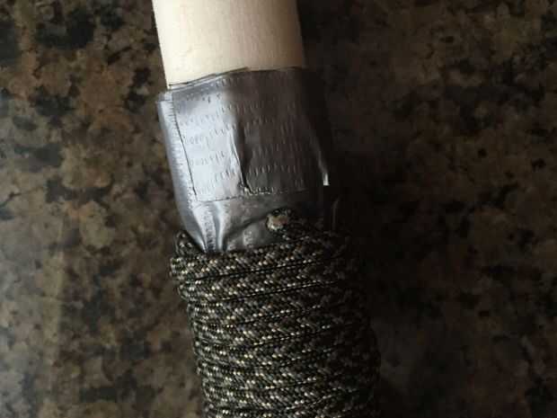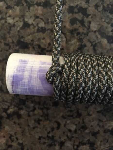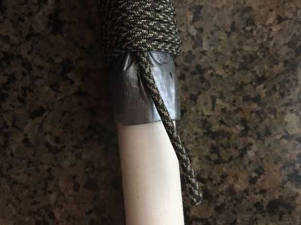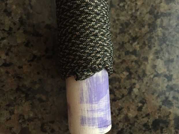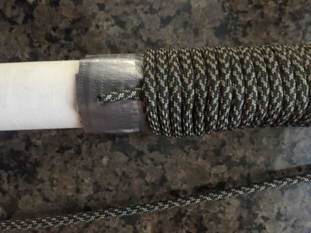 Para ser sinceros no parece demasiado buena con solo la cinta así que vamos a hacer un mango de paracord envolver. Tomar una sección de paracord que está sobre dos veces tanto como la sección del pvc que se desea cubrir. Haga un bucle que va en una dirección horizontal a lo largo de la pvc. Y asegúrela con las dos bandas de goma. Ahora la sección más larga de la paracord y envuelva poco a poco el pvc bien. Al llegar a la primera banda de caucho solo baje el pvc fuera del camino. Una vez que tenga el mango entero envuelto tire de la cadena más larga a través del lazo que se hizo. Ir al otro lado y jale la hebra suelta del cable para el bucle fuera de la vista. Ahora corte el exceso y selle con un encendedor. Ahora que terminaste!