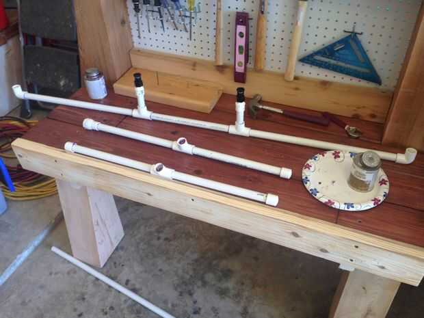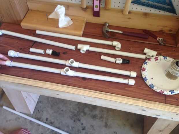 Encontrado mejor montar la piernas, luego la viga superior, luego coloque los dos 5' postes. Cuando se junta la viga superior, asegúrese de alinear los codos y bajadas de agua de la regadera. Mismo cuando está sujetando las piernas. Deje que el pegamento seque durante la noche o por lo menos 2 horas antes de usar el "car wash".