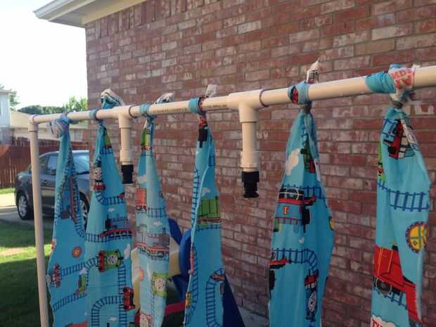 Cortamos algunos sobra tela en tiras de 4 a 6 pulgadas que fueron cerca de 3 pies de largo. Luego ató las tiras a la viga superior de la colada de coche y les deje que cuelgue. Esto hace más interesante, la colada de coche un también ayuda a más de agua por goteo hacia abajo en vez de tirar hacia fuera.