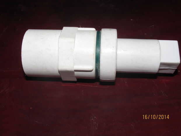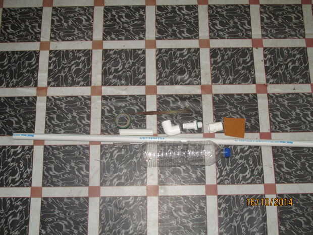 Para hacer esto usted necesitará: una longitud de tubería de PVC de media pulgada (un poco más corta que desea que el personal), un codo de 90 grados, una longitud de seis pulgadas de tubo de media pulgada, media pulgada junto tornillo de montaje (ver foto 2), papel de lija o un archivo, una botella de refresco y cinta eléctrica opcionalmente algunos color para camuflaje.