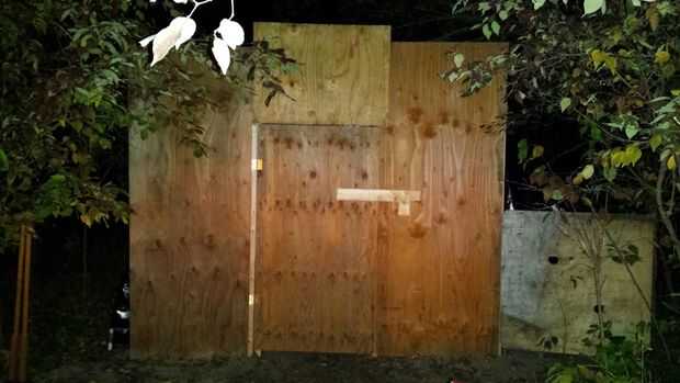 Construimos un fascade simple con una puerta que conduce al túnel. Esto se hizo por enterrar y prensado 2 x 4 en la tierra para la ayuda estructural. La chapa es madera contrachapada de chatarra de 1/4 pulgada que nosotros habíamos utilizado anteriormente para un proyecto diferente. Utilizan tornillos para sujetar todo juntos.