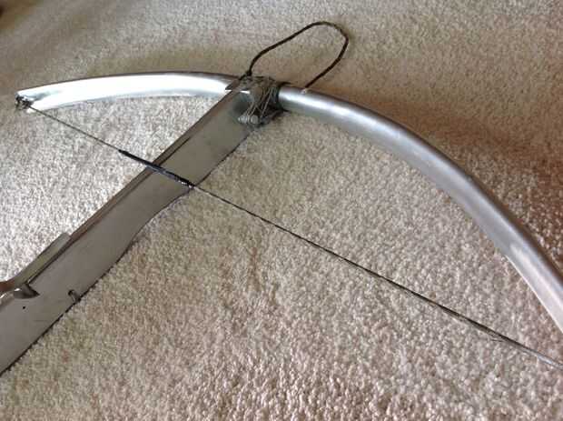 una muy fácil de construir crossbow.the stock es realmente pino pero prod (arco) es pvc.the estribo es sólo una pieza de para cable de así es la cadena pero con algunos tape.the de conducto es aerosol pintado silver.it brotes bien fast.all que tuve que comprar fue la madera que me costo sobre $5 en Nueva Zealand(which is where I live).if tienes que comprar todos los materiales y costaría $25-$ 30 que supongo.