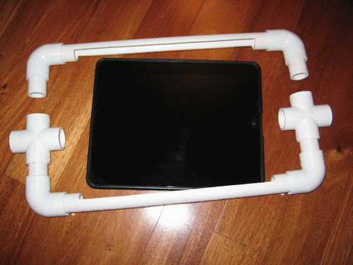 Aquí es la parte de soporte del iPad del Monte.  Quise cortar una ranura en los tubos al principio pero que resultó para ser demasiado difícil e innecesaria.  Era mucho más fácil dibujar una línea recta a ambos lados de PVC y luego correr a lo largo de una esmeriladora de banco hasta alcanzar la línea de la rueda.  Asegúrese de que usted use mangas largas, una máscara y protección ocular al PVC ya que blanco polvo de PVC viene del molino va a todas partes y no es bueno para sus pulmones.