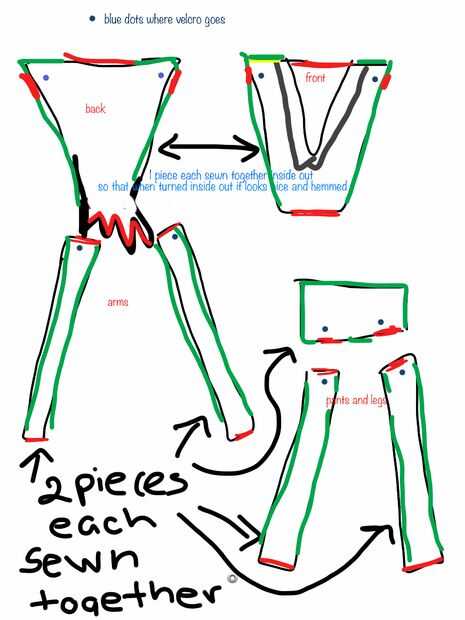 Recuerde que las aberturas no cose juntos (marcado en rojo en el diagrama) en esto es donde la cosa en velcro.