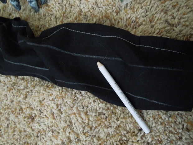 Tiempo para el lápiz blanco de la tela! Coloqué todas mis piezas en el piso para tener una idea de cómo iba a dibujar las rayas de alfiler.