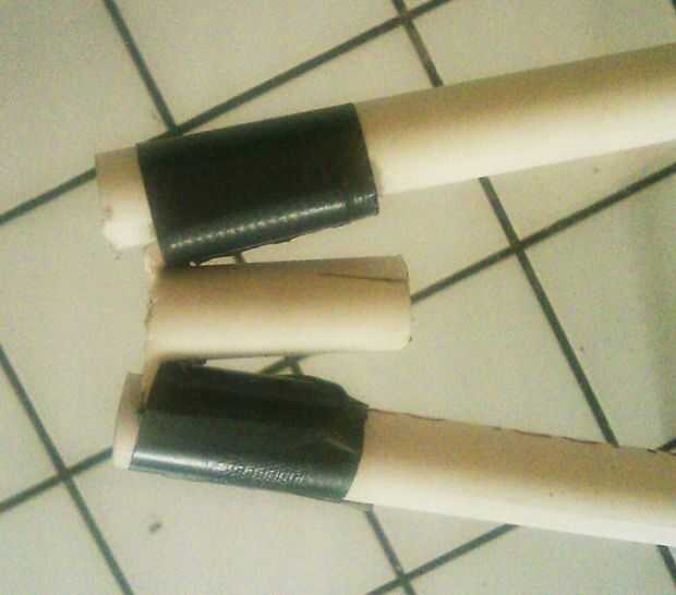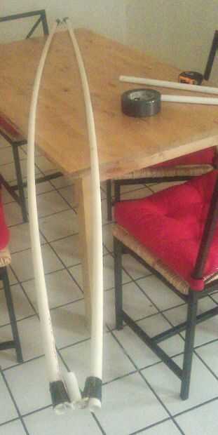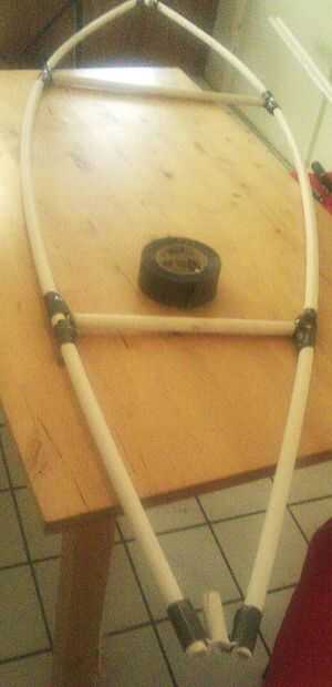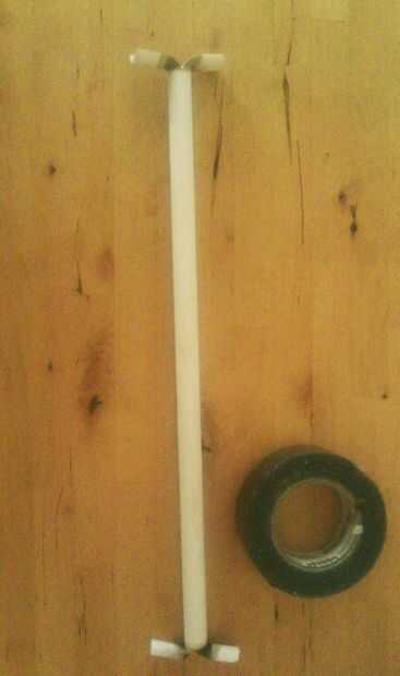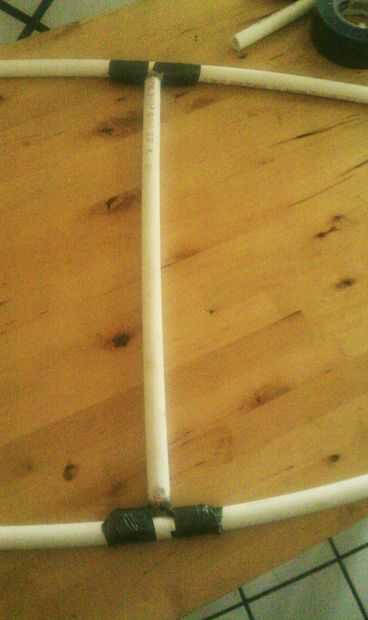Tomar el tubo entero de 2' PVC y el tubo de PVC que corte las abrazaderas de y hacer similar cortes en ambos extremos de cada tubo, aproximadamente de 2" de profundidad. Doble las alas hacia atrás perpendiculares a la tubería de cada extremo quede en forma de "T". Presione el tubo contra una superficie plana para que todos cuatro alas son planas entre sí.